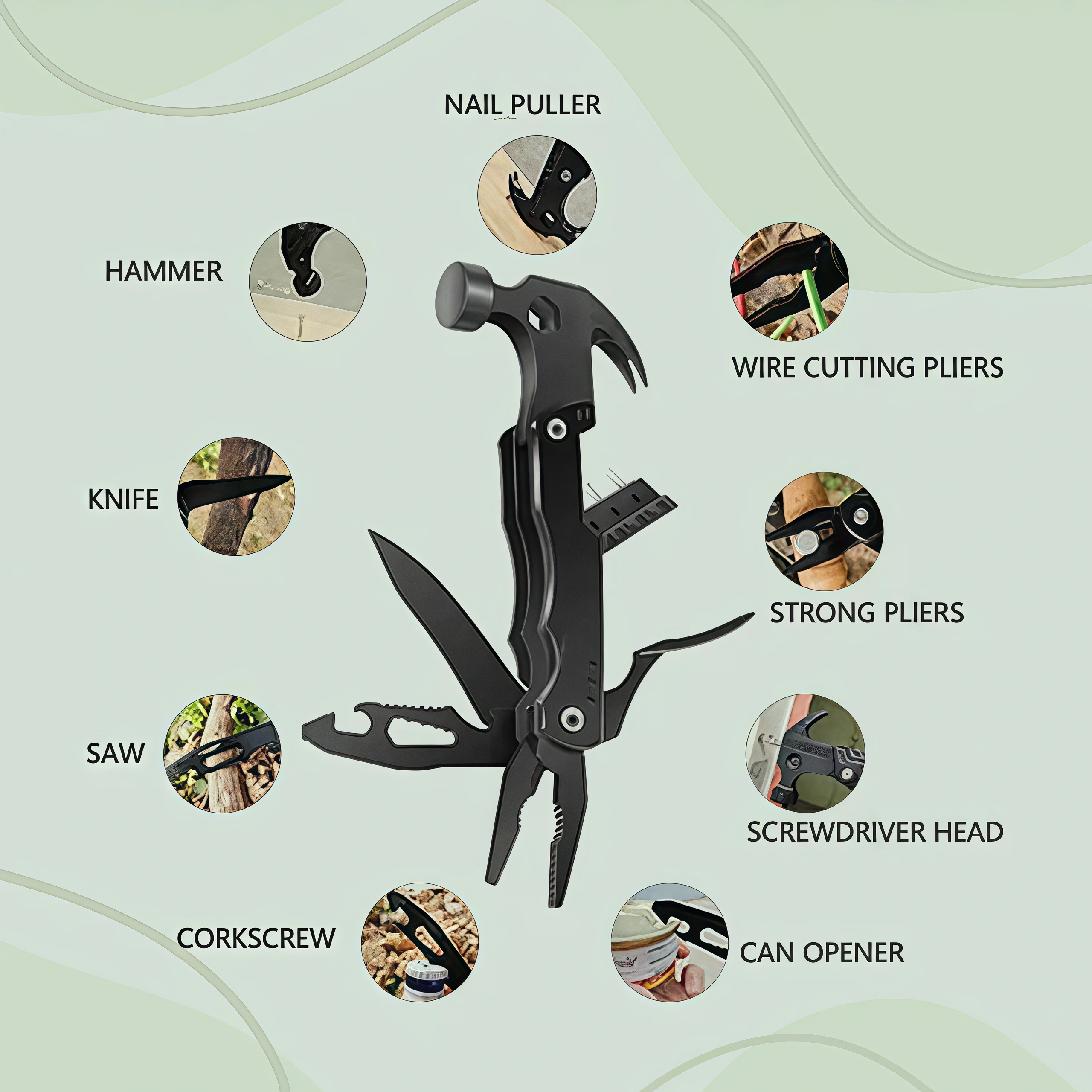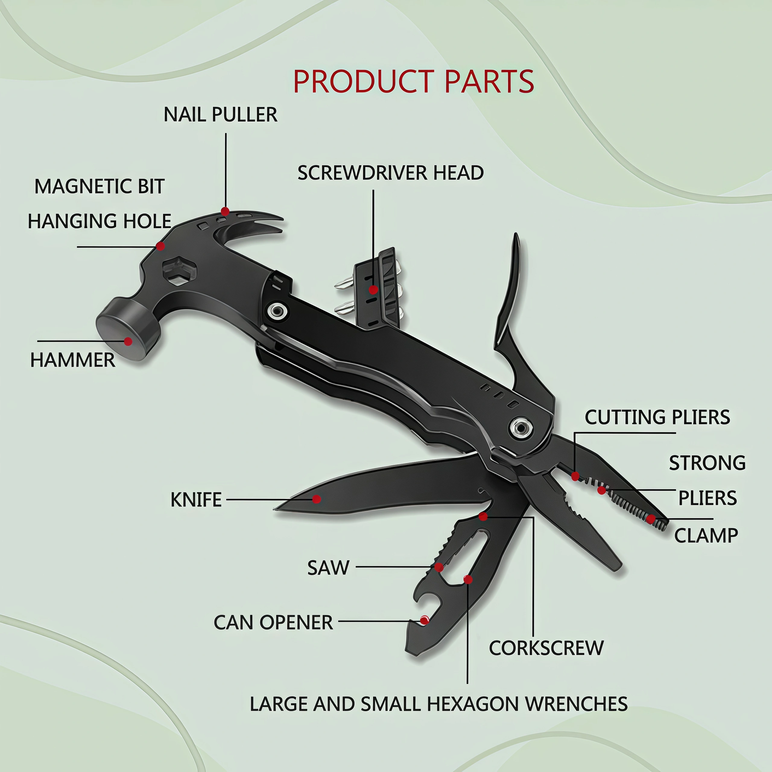 • Key Functions: Pliers, Hammer, Saw, Bottle Opener, Screwdrivers, etc.