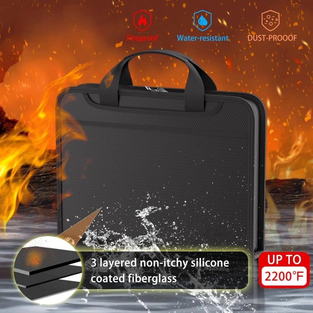 Made with three layers of silicone-coated fiberglass, this file storage bag withstands up to 2200℉ (1200℃), offering fire and water protection for your documents in emergencies.