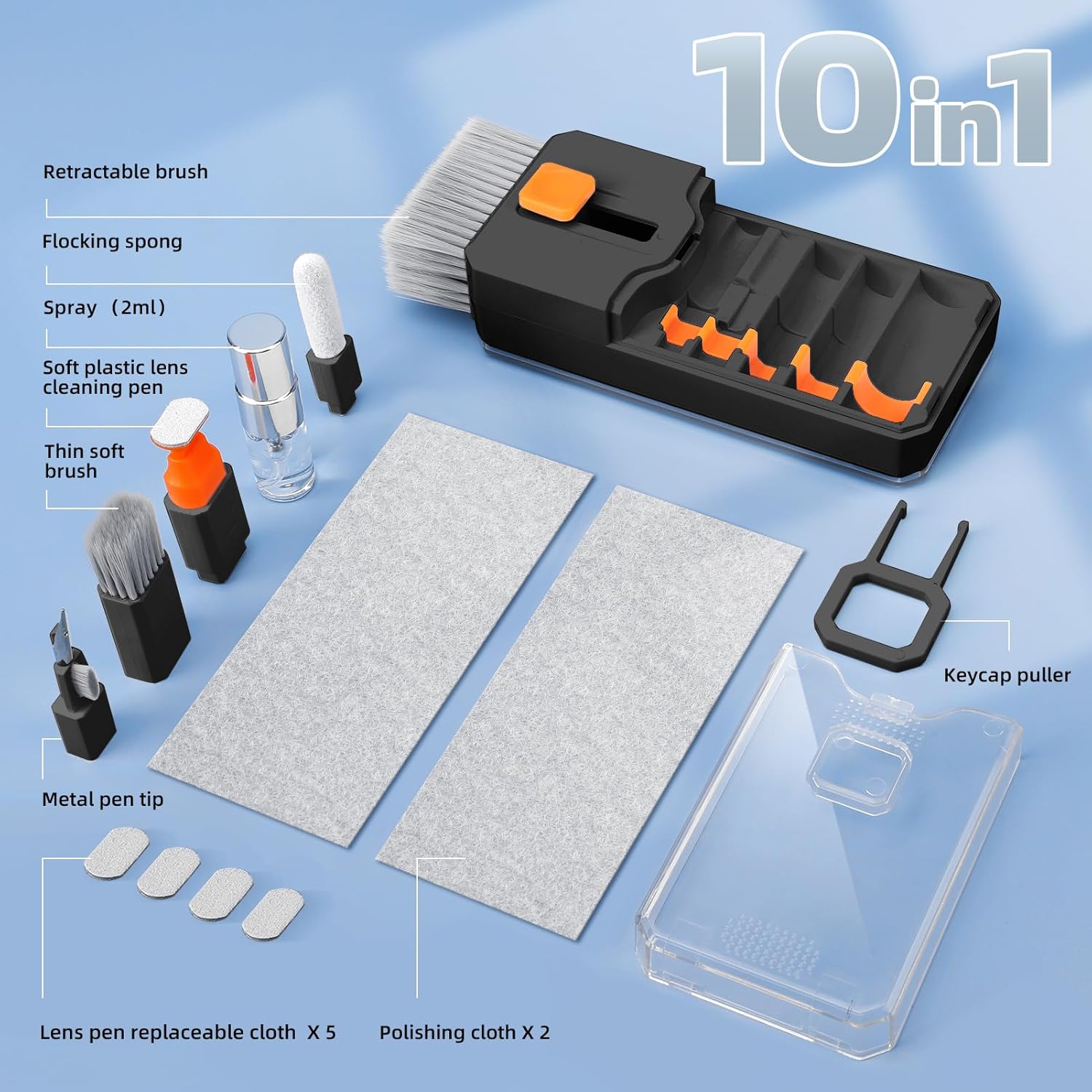 • Cleaning Components: Retractable Brush, Metal Pen Tip, Flocked Sponge, Fine Soft Brush
