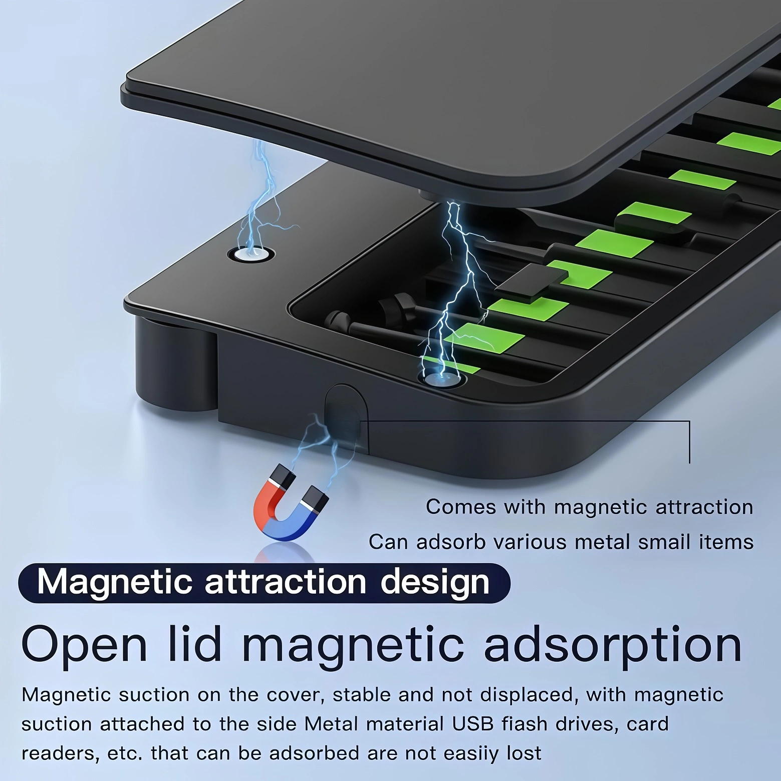 The wrist rest features a secure magnetic closure for the integrated tool compartment. An additional external magnetic strip on the side firmly holds small metal accessories like ejector tools or thumb drives, preventing loss and keeping your desk organized.