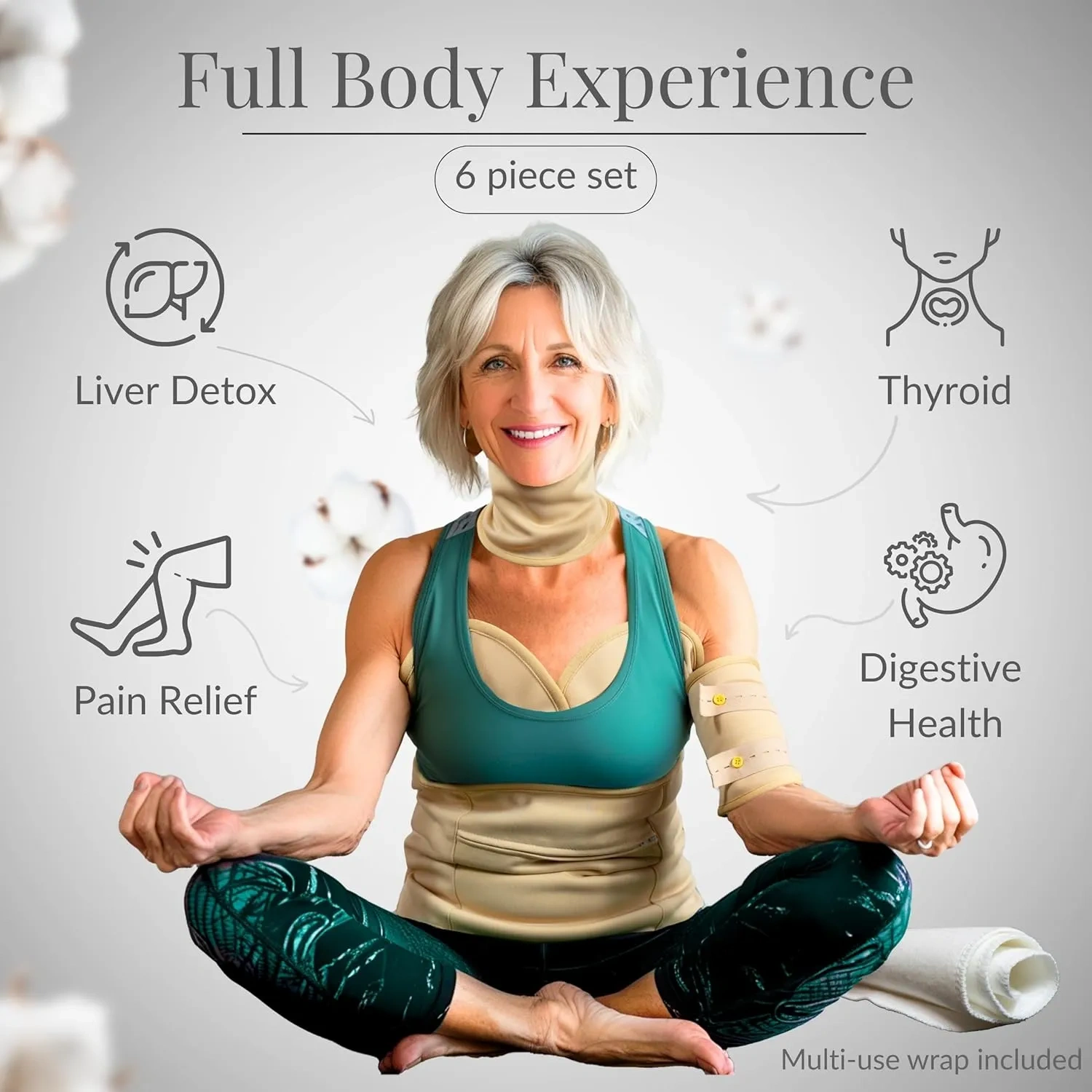 This castor oil pack set includes 1 abdominal wrap, 2 chest wraps, 1 thyroid neck wrap, 1 multipurpose wrap, 1 joint wrap (for knees, arms, or legs), and 1 laundry bag. It’s designed to provide comfort and care from head to toe, meeting your daily care needs.